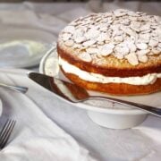 I have been making this cake for years. It is made with a combination of almond flour and all-purpose flour for a light and fluffy texture, and it is flavored with almond extract and topped with almond syrup for a perfectly balanced almond flavor. The creamy light whipped cream filling just brings it all together for a light delicious cake that is perfect for any occasion.