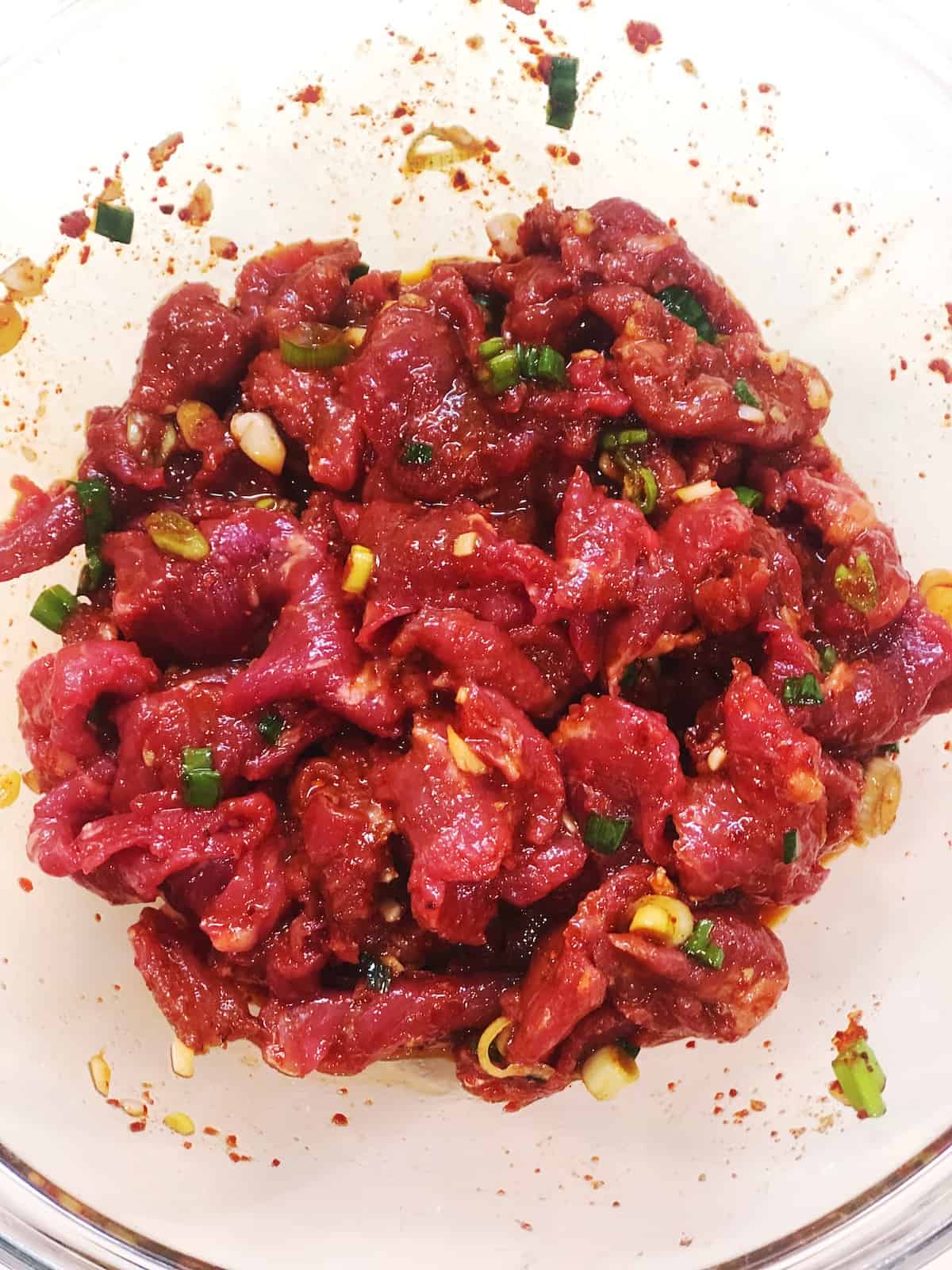 - Add beef to the marinade and mix well to coat all the beef in the sauce. Let sit for at least 20 minutes. The beef can marinate up to 24 hours in advance.