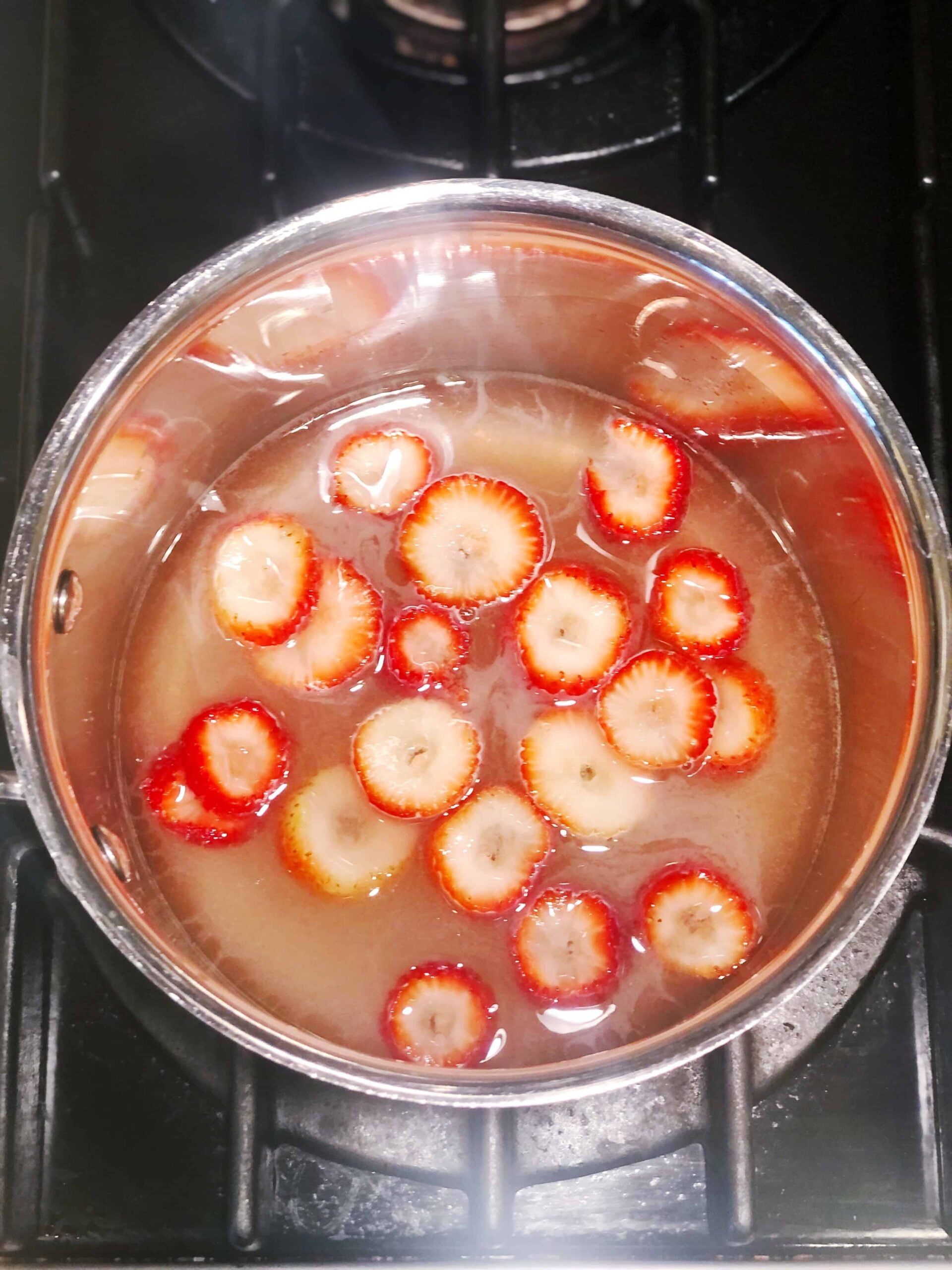 The steps to making this strawberry simple syrup are really easy. You just add all of your ingredients into a saucepan, bring to a boil, and let simmer for 10 minutes.