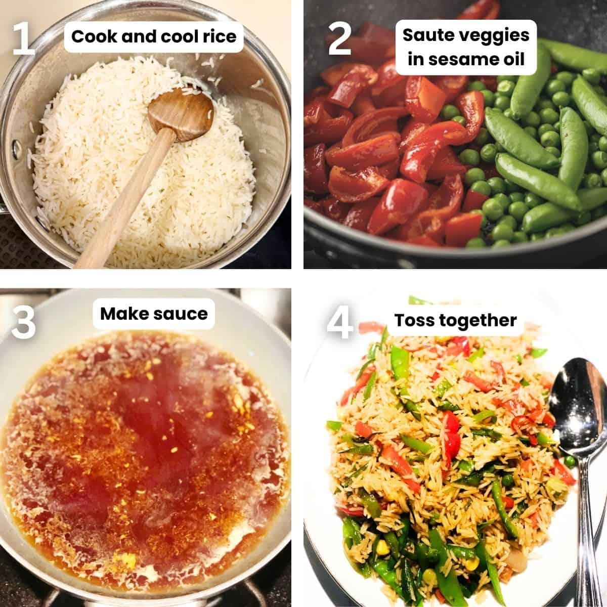 - Add cooked rice and sauce and toss well.4 cups Cooked and cooled basmati or jasmine rice